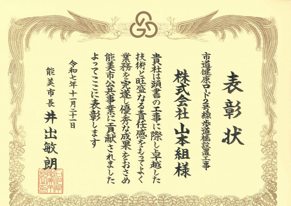 このたび、当社が施工した「市道健康ロード2号線歩道橋設置工事」が、令和7年度 能美市優良建設工事として、11月21日に表彰を受けました。 本工事は、技術力・安全管理・環境配慮のいずれにおいても優れており、地域の安全性および利便性の向上に大きく寄与する工事であるとともに、他の模範となる優良な工事である点が高く評価されました。 今後も地域社会に貢献できるよう、より一層精進してまいります。 FacebookXBluesky